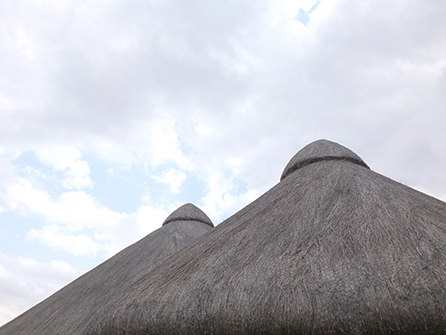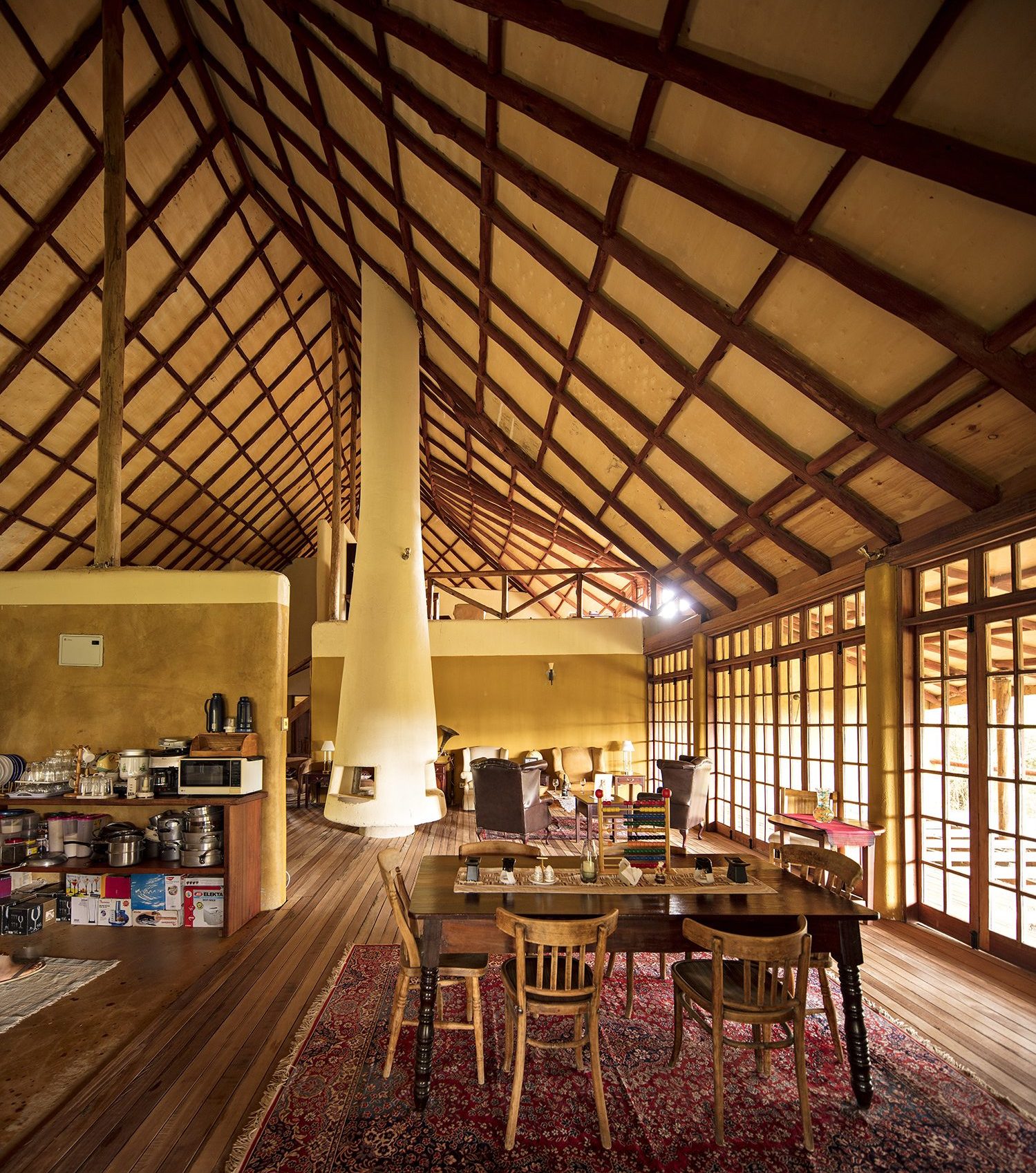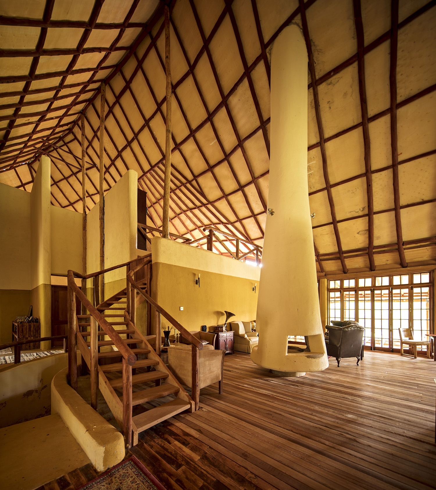 A thatched roof, contemporary design, organic forms and a central fireplace.