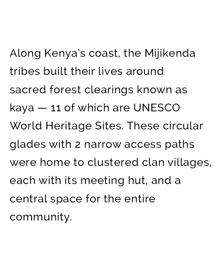 Along Kenya’s coast, the Mijikenda tribes built their lives around sacred forest clearings known as kaya — 11 of which are UNESCO World Heritage Sites. These circular glades with 2 narrow access paths were home to clustered clan villages, each with its meeting hut, and a central space for the entire community.